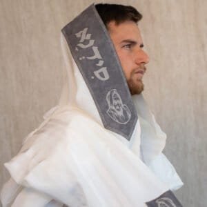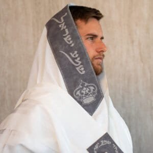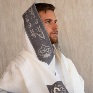טלית צמר לייזר עם עטרה ופינות צבע אפור בטון דגם בבא סאלי