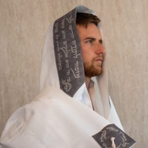 טלית צמר לייזר עם עטרה ופינות צבע אפור בטון דגם יברכך ה’ וישמרך