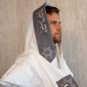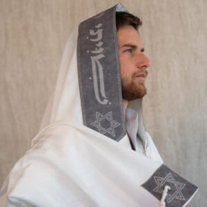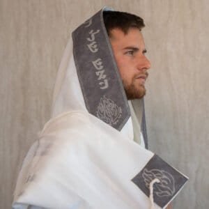 טלית צמר לייזר עם עטרה ופינות צבע אפור בטון דגם האש שלי