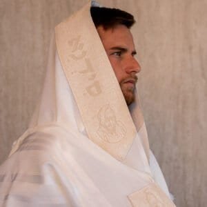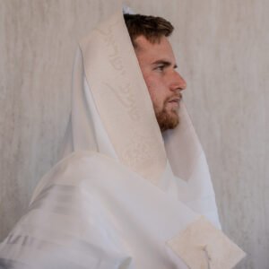 טלית צמר לייזר עם עטרה ופינות צבע לבן דגם האש שלי
