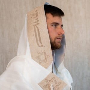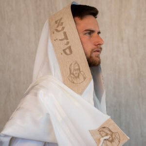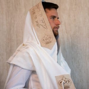 טלית צמר לייזר עם עטרה ופינות צבע פשתן אבן דגם בבא סאלי