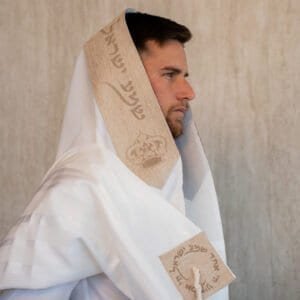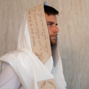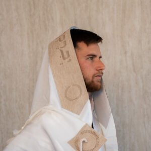 טלית צמר לייזר עם עטרה ופינות צבע פשתן אבן דגם שויתי השם