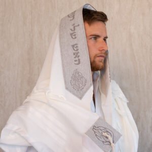טלית צמר לייזר עם עטרה ופינות צבע פשתן אפור דגם האש שלי