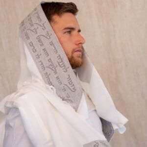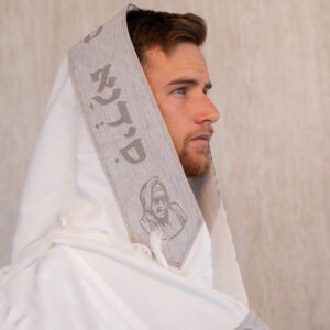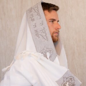 טלית צמר לייזר עם עטרה ופינות צבע פשתן אפור דגם בבא סאלי