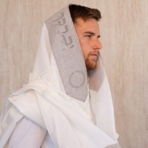 טלית צמר לייזר עם עטרה ופינות צבע פשתן אפור דגם שויתי השם