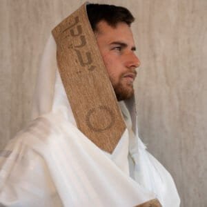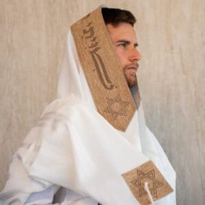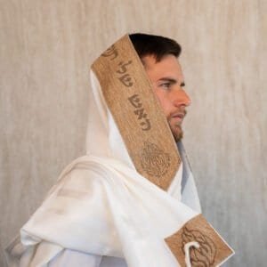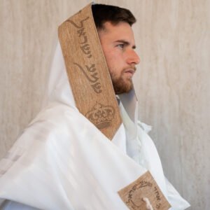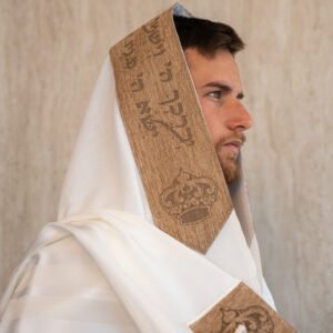 טלית צמר לייזר עם עטרה ופינות צבע פשתן קאמל דגם שויתי השם