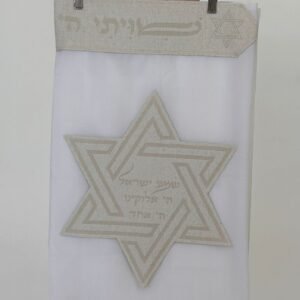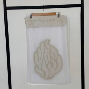 טלית צמר פרימיום כולל עטרה פינות וסמל דגם האש שלי לבן פנינה מידה 60 – (140/190 ס”מ)