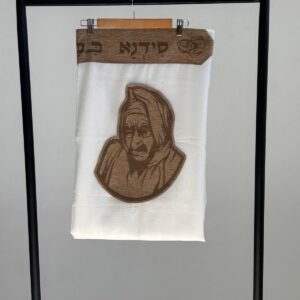 טלית צמר פרימיום כולל עטרה פינות וסמל דגם בבא סאלי פשתן קאמל מידה 60 – (140/190 ס”מ)