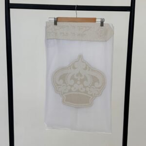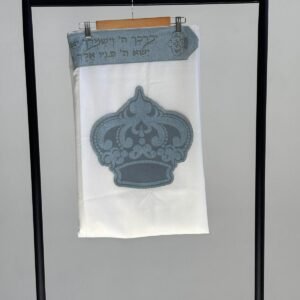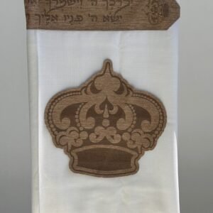טלית צמר פרימיום כולל עטרה פינות וסמל דגם כתר לבן פנינה מידה 60 – (140/190 ס”מ)