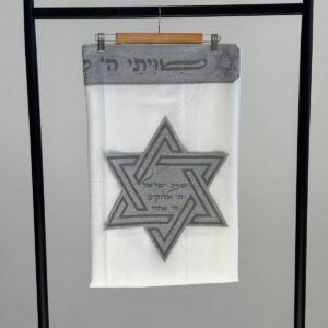 טלית צמר פרימיום כולל עטרה פינות וסמל דגם מגן דוד צבע פשתן אפור מידה 60 – (140/190 ס”מ)