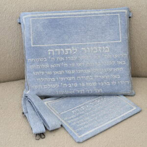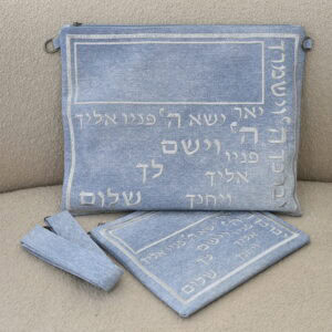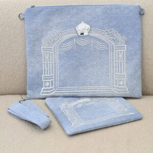 סט תיקים דגם ברכת הכהנים דמוי עור צבע ג’ינס תכלת בהיר רקמה בשחור כולל רצועה וידית נשיאה