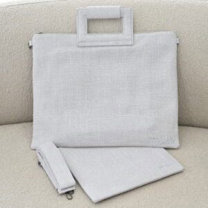 סט תיקים פשתן דגם קלאסי אפור בהיר רקמה בכסף כולל ידית ורצועה