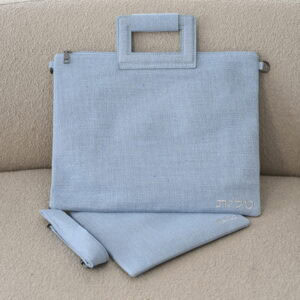 סט תיקים פשתן דגם קלאסי תכלת רקמה בכסף כולל ידית ורצועה