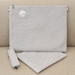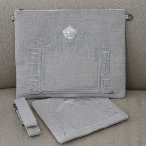 סט תיקים פשתן דגם כתר כהנים אפור בהיר רקמה וכתר בכסף כולל רצועה