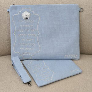 סט תיקים פשתן דגם כתר כהנים צבע תכלת רקמה וכתר בכסף כולל רצועה