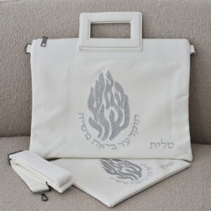 סט תיקים דמוי עור לבן דגם האש שלי רקמה בכסף כולל רצועה וידית נשיאה