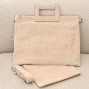 סט תיקים פשתן דגם קלאסי קרם רקמה בכסף כולל ידית ורצועה