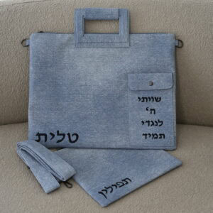 סט תיקים דמוי עור ג’ינס בהיר דגם כיס רקמה בשחור כולל רצועה וידית נשיאה