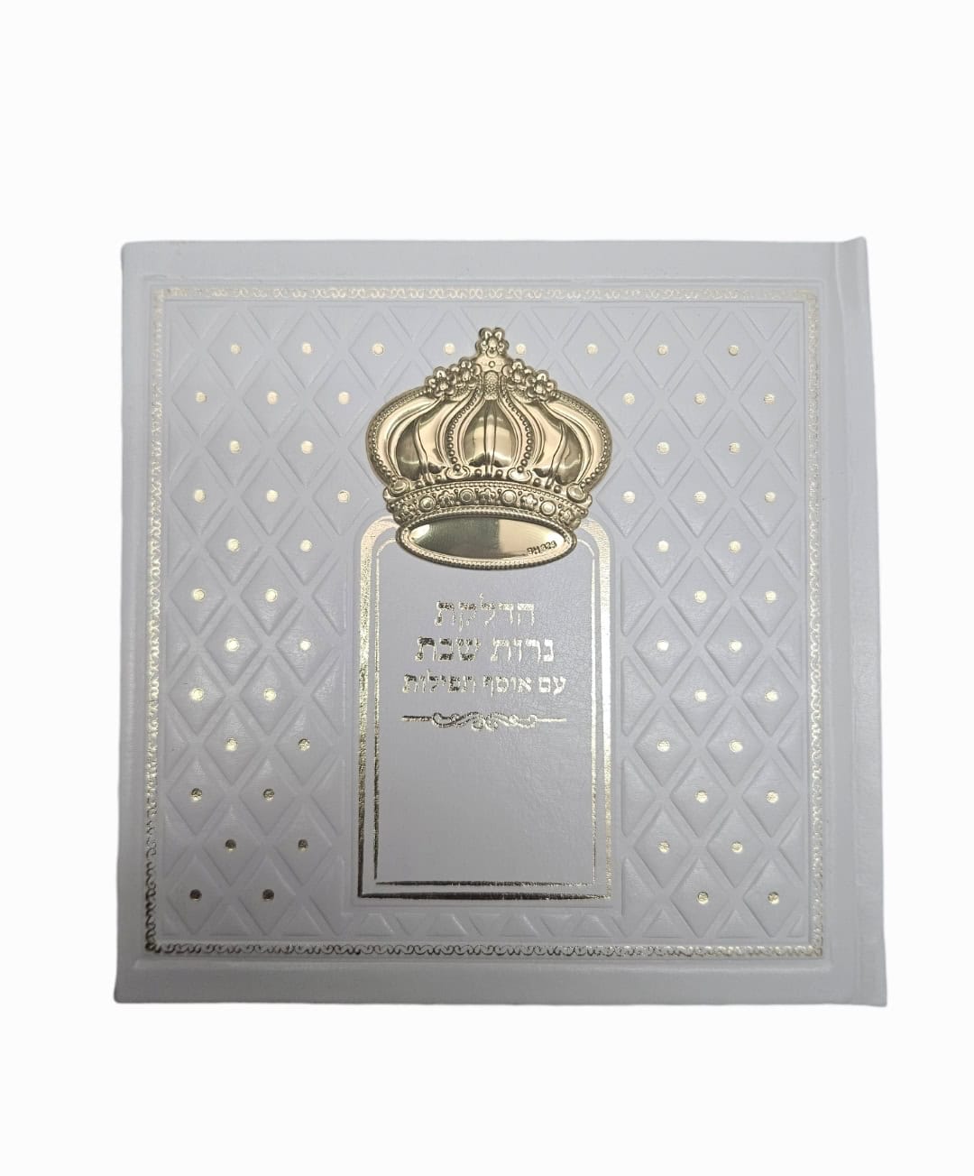 הדלקת נרות שבת עם אוסף תפילות דמוי עור לבן עם כתר זהב 15/15 ס”מ