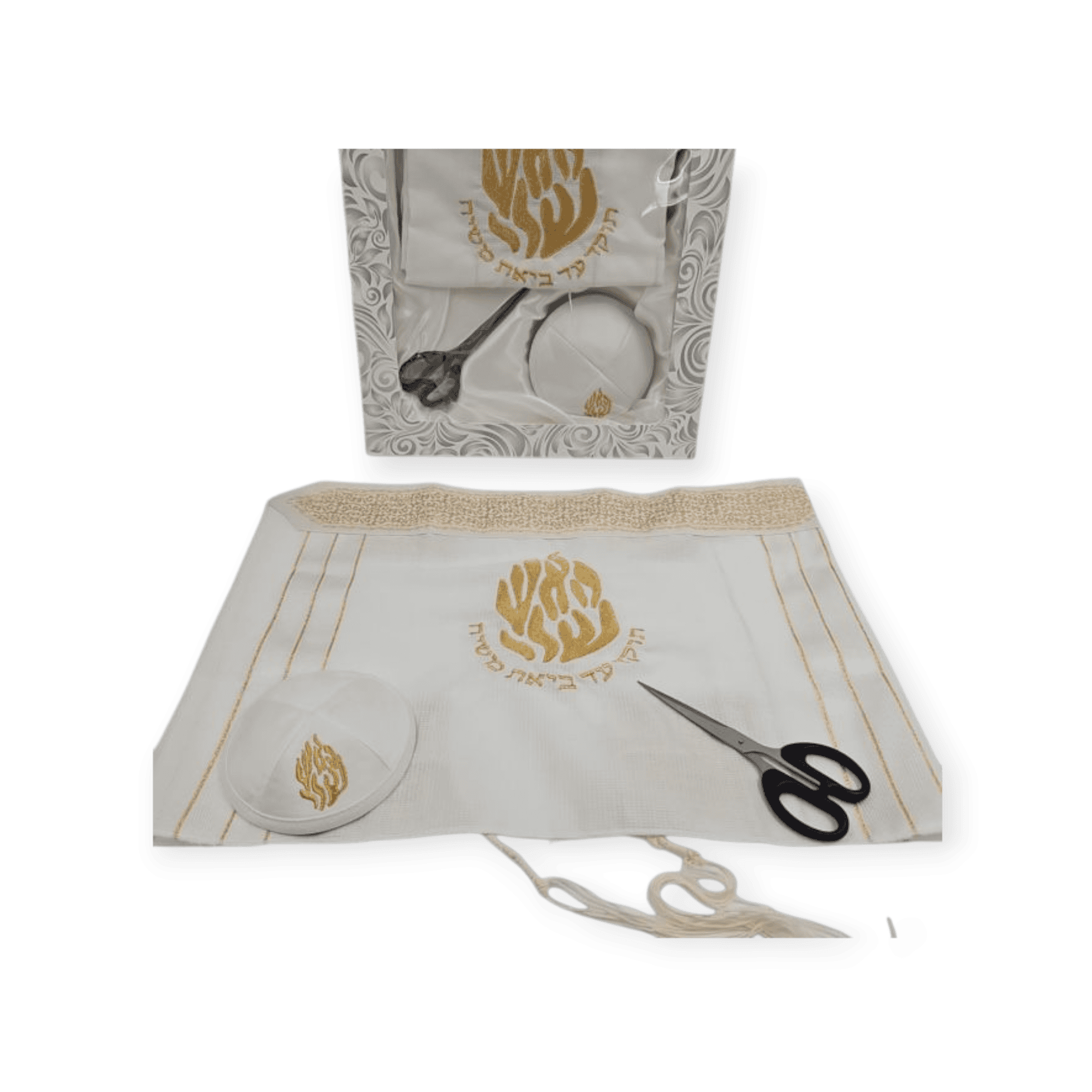 סט חלאקה הכולל: טלית תשבץ רקמה האש שלי זהב 90/35 ס”מ ,כיפה קטיפה, ומספריים