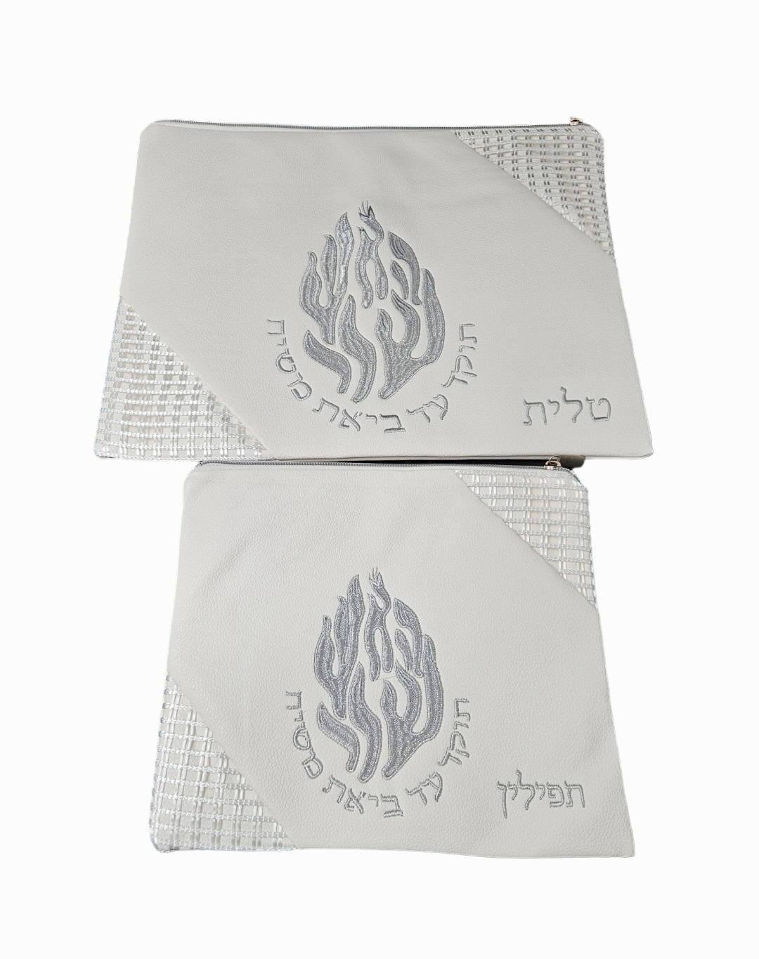 סט כיסויים לטלית ותפילין דמוי עור האש שלי לבן כסף (גדול 35/30 ס”מ קטן 26/23 ס”מ)