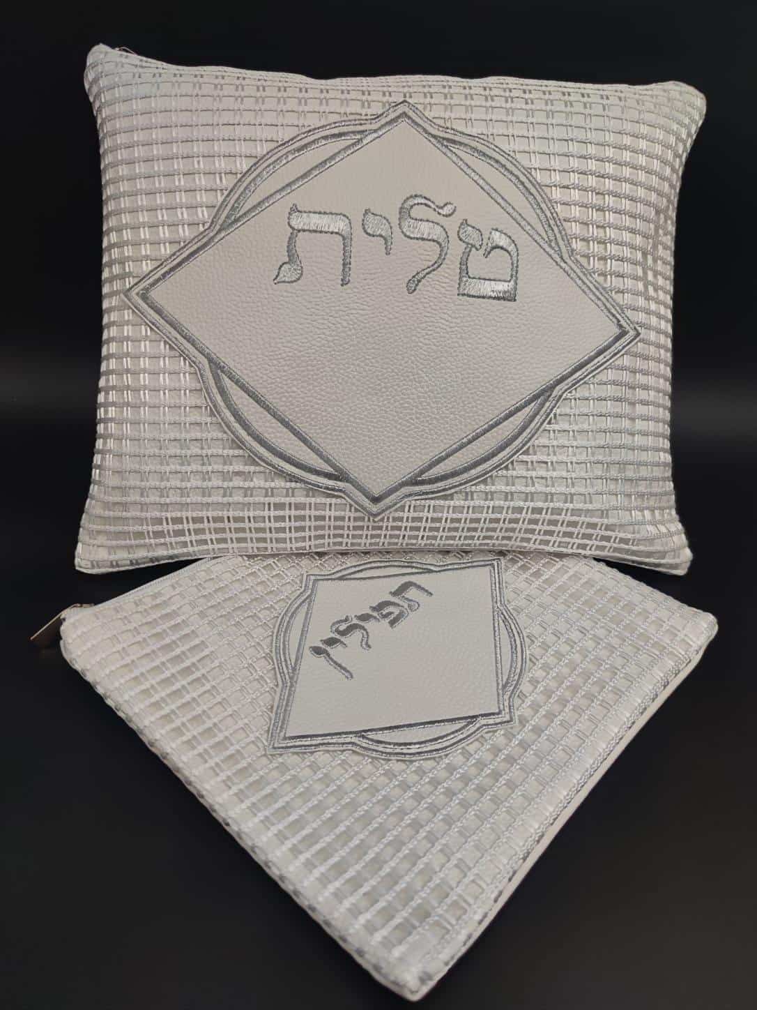 סט כיסויים לטלית ותפילין דמוי עור רשת משולש לבן (גדול 35/30 ס”מ קטן 26/23 ס”מ)