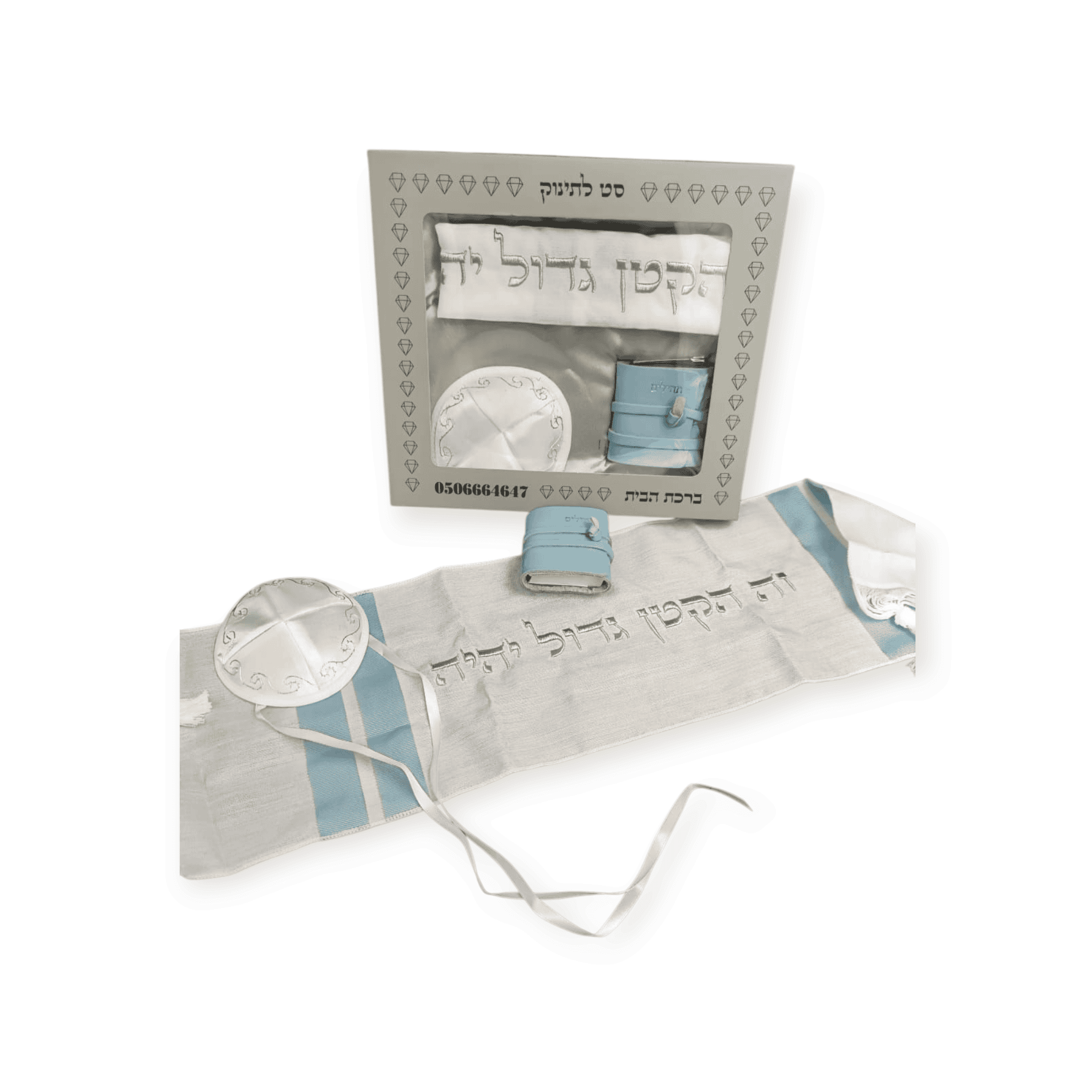 סט לתינוק הכולל: טלית ילדים רקומה פסים תכלת, תהלים סיכה לעגלה, כיפה עם שרוך לקשירה